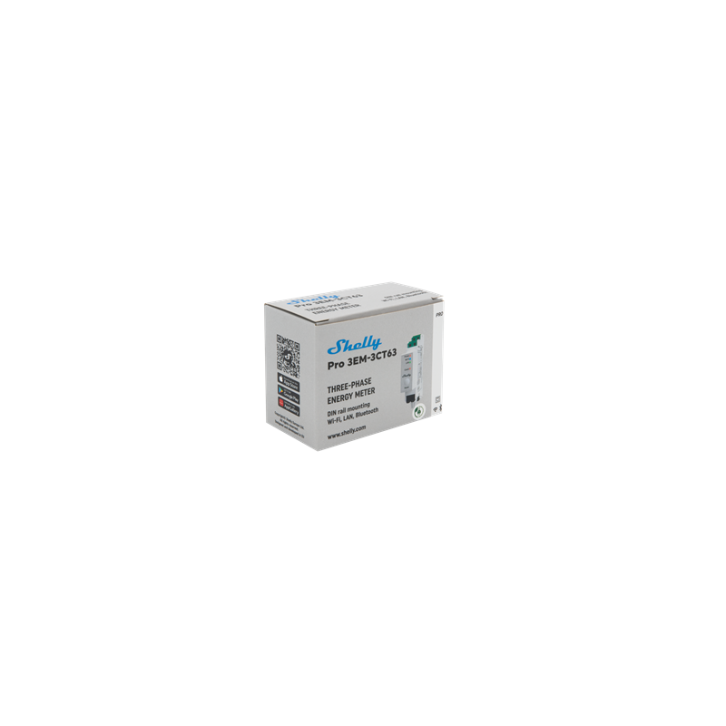 Shelly Pro 3EM-3CT63 (the Device) is a DIN rail mountable single or three-phase energy meter. Enhanced with all the gen2 firmware flexibility and LAN connectivity, it provides professional integrators with additional options for end-customer solutions. It can work standalone in a local LAN and/or Wi-Fi network, or it can also be operated through cloud home automation services through Modbus, MQTT, HTTP, and WebSocket. All inbound connections support TLS.